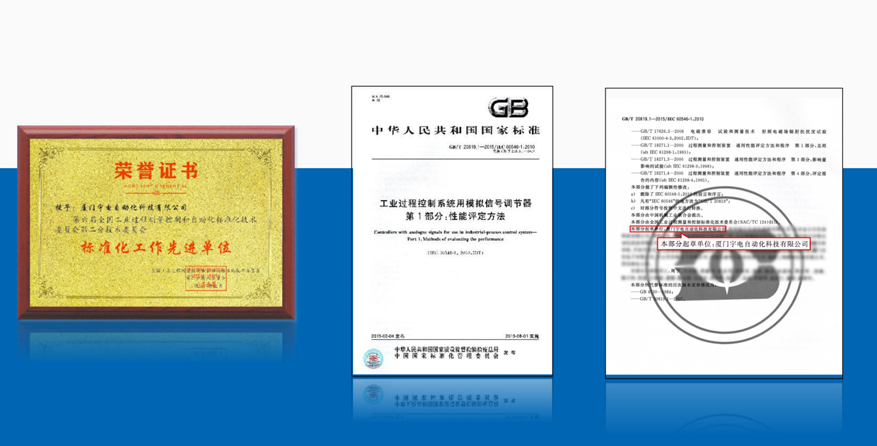 宇電積極參與國家標(biāo)準(zhǔn)制定工作,主持起草了《GB/T 20819.1-2015 工業(yè)過程控制系統(tǒng)模擬信號調(diào)節(jié)器》標(biāo)準(zhǔn),該標(biāo)準(zhǔn)為溫控器調(diào)節(jié)器最主要的國家標(biāo)準(zhǔn);并參與《溫度測量設(shè)備電子數(shù)據(jù)交換用屬性列表》等50多項國家標(biāo)準(zhǔn)制定。